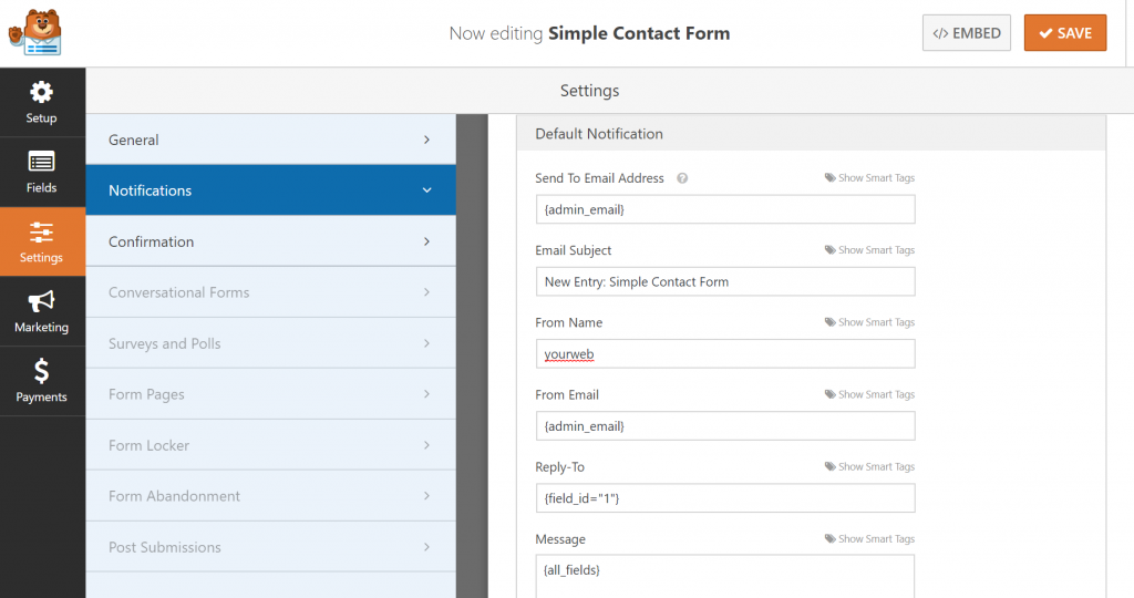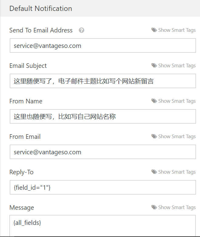 比如第一块是姓名,那就是{field_id=”0″},第二块是email,那就是{field_id=”1″},这里的短代码不需要手动输入,可以点击右上方的show smart tags看到此处可以填的内容。